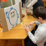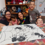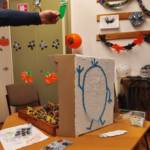 Ezután a csoportok kedvük szerint választottak állomást. Az egyik teremben a résztvevők egy kis tökkel leguríthatták, majd felépíthették a boszorkány-piramist. Ezzel párhuzamosan szörnyecskéket lehetett körbetekerni fonallal, amely a finommotorikát erősítette. A szörnyecskéket haza is vihették a gyerekek. A következő feladat egy őszi szenzoros dobozban elrejtett Halloween-i kincsek megtalálása volt. Gesztenyék, bogarak, csigaházak, bábok bújkáltak a falevelek alatt. A kézműves szobában kézlenyomattal pókokat készíthettek a gyerekek egy óriási pókhálón. A szorgosabbak meg Halloween-i dekort alkottak ragasztással, fűzéssel, sodrással és tépéssel.